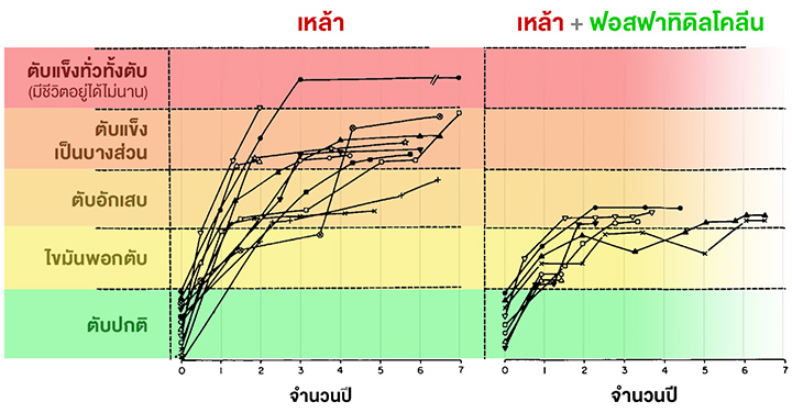 จากข้อมูลดังกล่าวพบว่า ลิงบาบูนที่ได้รับเหล้าจะพัฒนาไปเป็นตับแข็งเกือบทุกตัวภายใน 6 ปี แต่หากได้รับเหล้าร่วมกับฟอสฟาทิดิลโคลีน จะไม่เป็นตับแข็งแม้แต่ตัวเดียว
